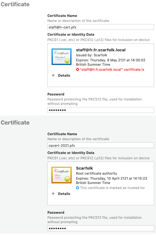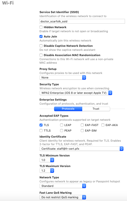 Create a profile that contains the client certificate, the root CA certificate and the wireless configuration for the SSID. The certificates must be in PKCS12 format with a password. The wireless configuration sets the SSID, the security type (WPA2 Enterprise), EAP Type of TLS and the identity certificate.